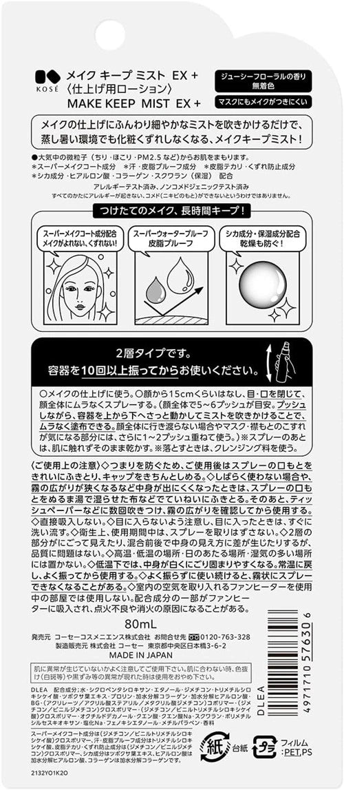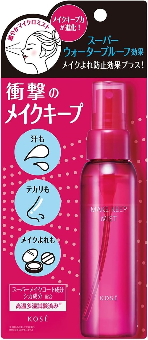 KOSE Makeup Keep Mist EX is a finishing spray designed to help keep makeup in place for longer hours. It forms a light, invisible layer over the skin to reduce makeup slipping caused by sweat, sebum, and humidity. Ideal for daily wear, busy days, or warm weather.